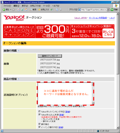 出品ナビ、商品データ登録・編集画面の「説明」部分に加えたキーワードが検索の対象となります。